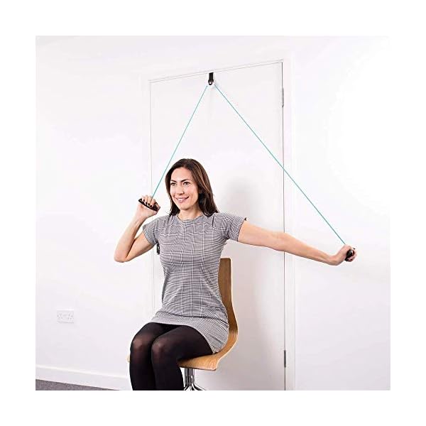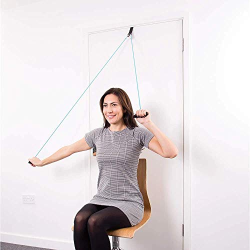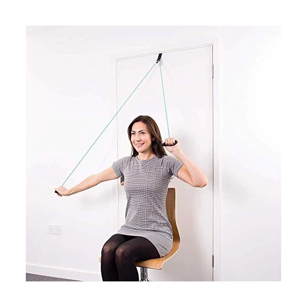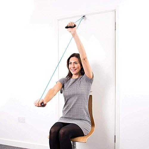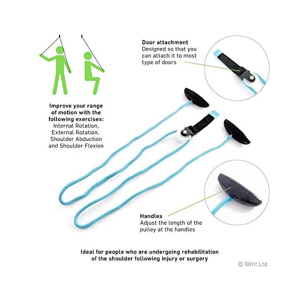 So einfach und doch so schlau und effektiv: dieses Trainingsgerät ist genau das Richtige für die Verbesserung Ihres Bewegungsumfangs mithilfe einer Vielzahl von Rotations-, Abduktions- und Flexionsübungen. Befestigen Sie es einfach an einer Tür und schon kann das Training beginnen. Es ist besonders für die Rehabilitation von Schultern nach einer Verletzung oder Operation hilfreich. Der 66fit Schultertrainings-Pulley bietet zwei Griffe und wurde so entwickelt, damit er an die meisten Türen angebracht werden kann. Eigenschaften – Material: Strick/PVC – Farbe: Aqua/Schwarz – Beschreibung – Dieses einfache, aber extrem effiziente Sportgerät ist ideal für Menschen, die sich in der Rehabilitation nach einer Schulterverletzung oder -operation befinden. Der 66fit Schultertrainings-Pulley hilft dabei, den Bewegungsumfang zu verbessern. Übungen, die mit dem 66fit Schultertrainings-Pulley ausgeführt werden können: Innenrotation, Außenrotation, Seitheben und Schulterflexion