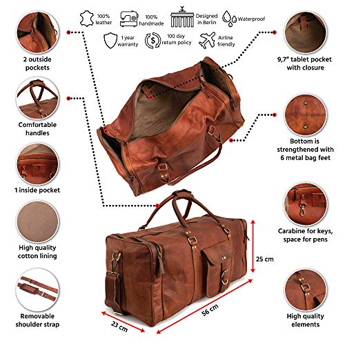 👍 ABMESSUNGEN & MATERIAL: Größe: 56x25x23 cm (L x B x H); Gewicht: 1,3 kg; Volumen: 35 Liter. Geeignet als Handgepäck bei den meisten Airlines. Die Reisetasche ist aus hochwertigem braunem (Farbe: Cognac) Leder gefertigt. Das Leder ist robust und langlebig. Das Innenleben besteht aus starkem Nylon. Bei Berliner Bags werden ausschließlich solide YKK-Reißverschlüsse verarbeitet. Die breiten Schultergurte sind verstell- und abnehmbar, sodass Sie Ihren Berliner Bag nach Ihren Vorlieben anpassen kön