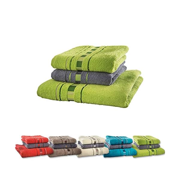 Das Frottierset beinhaltet 2 Handtücher (50×100 cm) und 1 Duschtuch (70×140 cm).