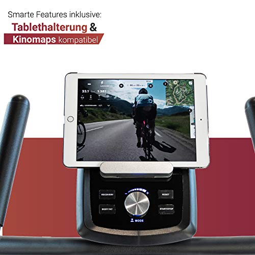 TECHNISCHE-DATEN: Max. Benutzergewicht: 130kg, 15 Programme, KINOMAP-kompatibel, ECB-Magnetbremssystem, Bremsstufen: 1-32, 10-350 im Watt-Programm, leiser Riemenantrieb, bodentiefer Durchstieg, Rückenlehne, selbstaufrichtende Pedalen mit Riemen, Transportrollen, Bodenniveauausgleich, Aufstellfläche (LxBxH): 150×66,5×130 cm, Gewicht: 57,2kg, Versandgewicht: 62kg (Speditionsgut), WEEE-Reg.-Nr. DE34088080 – Hinweis: Lieferung erfolgt bis zur Bordsteinkante. HINWEIS: Keine Lieferung auf den Inseln!
