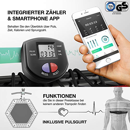 ✅ 𝗦𝗠𝗔𝗥𝗧𝗘 𝗙𝗜𝗧𝗡𝗘𝗦𝗦: Unser Fitness-Trampolin ist App-kompatibel und besitzt einen Smartphone- und Trinkflaschenhalter. Das Gymnastiktrampolin hat eine Konsole, die u.a. Ihre Sprünge zählt. Das Beste daran: Einen Pulsgurt liefern wir Ihnen gleich mit! So trainieren Sie jederzeit im optimalen Herzfrequenzbereich und bringen Ihre Fitness easy auf ein neues Level.