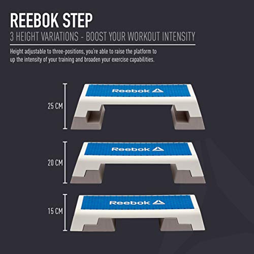 Die Entwicklung des Reebok Step bietet 3 schnell anpassbare Höheneinstellungen (15/20 / 25cm), mit denen Sie die Intensität Ihres Aerobic-Trainings an Ihr persönliches Fitnessniveau anpassen können. Klicken Sie einfach und verriegeln Sie die Füße auf die gewünschte Höhe und los geht’s. Die rutschfesten Gummifüße sorgen für eine solide, stabile Fitnessplattform
